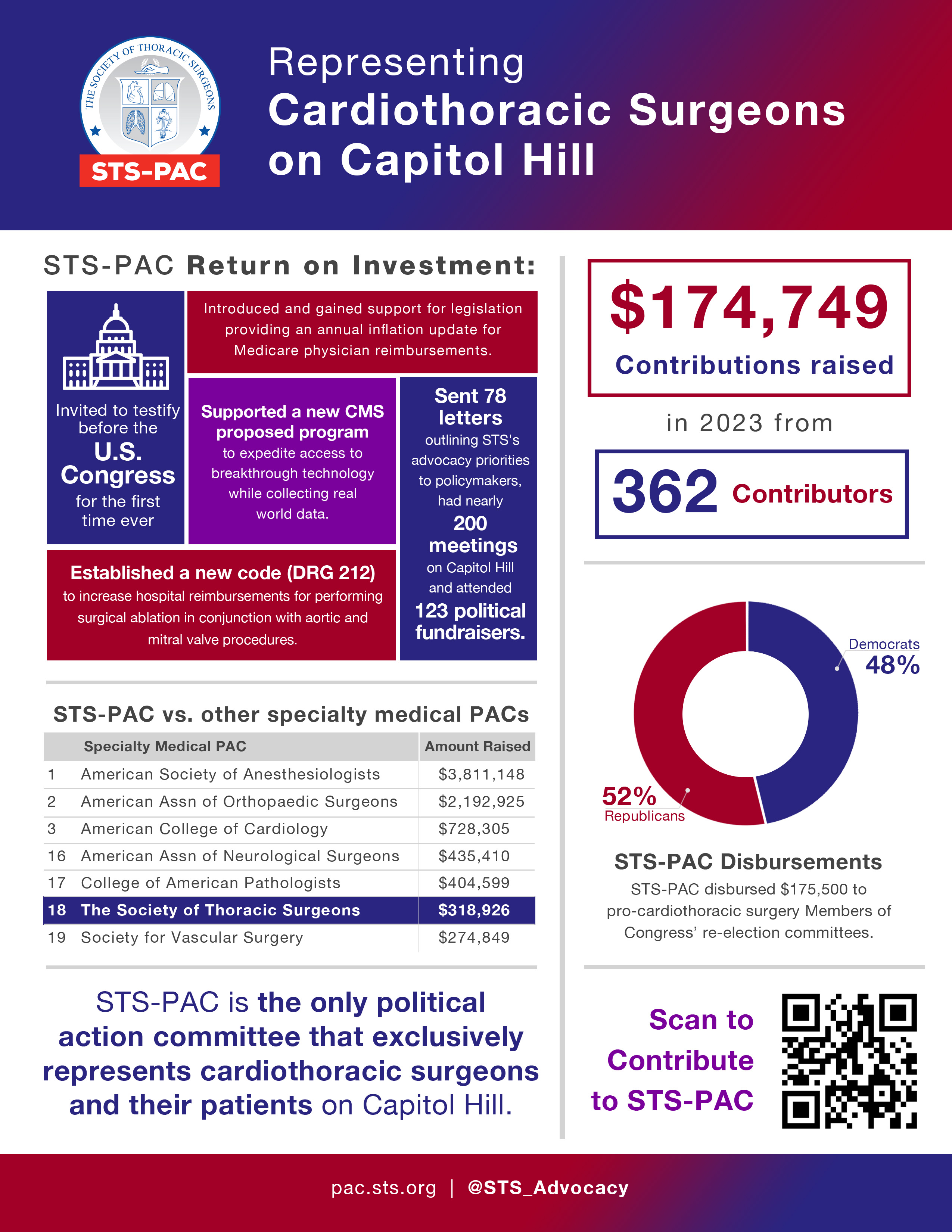 The Society of Thoracic Surgeons Political Action Committee (STS-PAC) is the only PAC specifically dedicated to representing the interests of cardiothoracic surgeons and their patients on Capitol Hill.