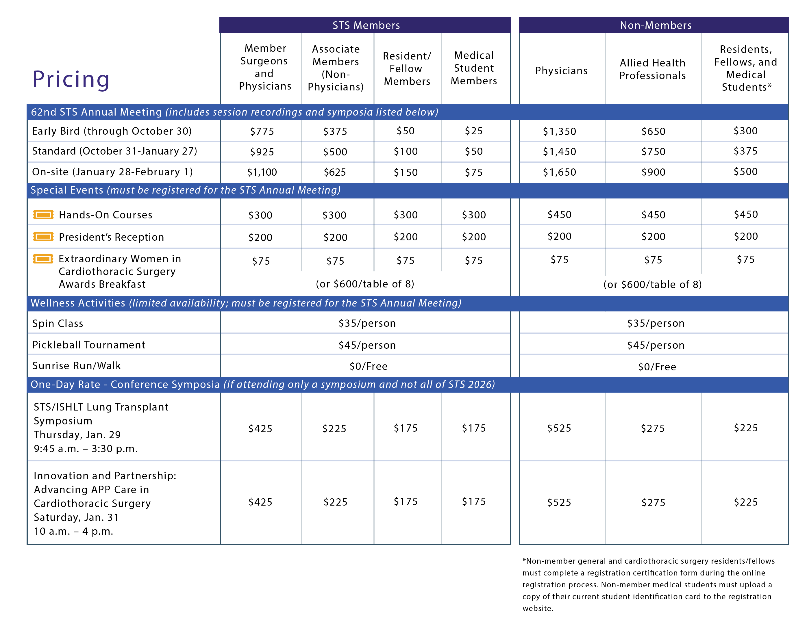 The STS Annual Meeting is the preeminent event in cardiothoracic surgery, offering more translational science and hands-on activities than any other educational event of its kind. The meeting features thought-provoking lectures, late-breaking research, and outstanding didactic and interactive educational programs, an expansive Exhibit Hall, and unique networking opportunities for every member of the cardiothoracic surgery team.