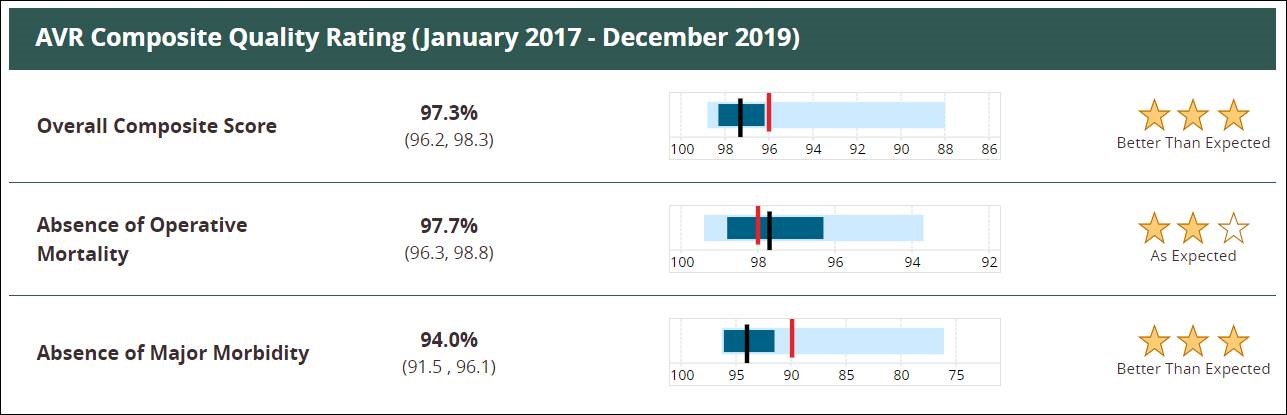 The updated Public Reporting site presents individual participant group scores in addition to—and in comparison to—overall participant outcomes. Not only does a participant webpage publicly report a participant’s numeric score and range for each composite measure, it also displays a graph demonstrating where those unique scores fall in relation to overall STS participant ratings. For each composite measure and its domains, the corresponding graph incudes a participant’s results (represented by a black vertical line), the statistical credible intervals around the results (dark blue shading), the overall/average STS results (red line), and the lowest-to-highest range across all North American Adult Cardiac Surgery Database participants (light blue shading).
