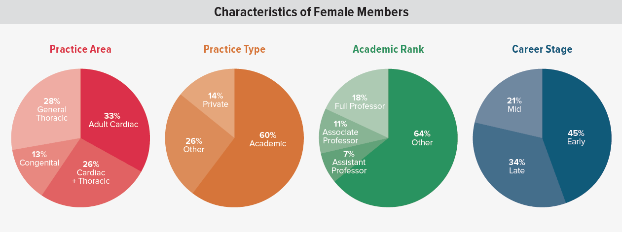 Among the four organizations—STS, AATS, EACTS, and ASCVTS—there are 788 female members. Interestingly, within this group, most practice academic medicine (60%), but only 5% are full professors.