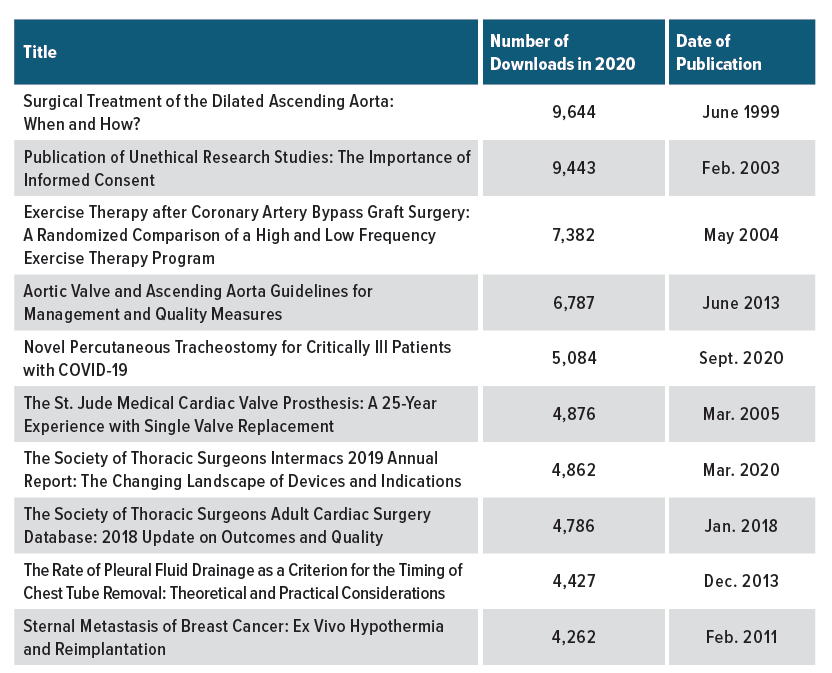The most-downloaded articles from The Annals of Thoracic Surgery varied widely in topic and scope in 2020. Some, like the most-downloaded article, “Surgical Treatment of the Dilated Ascending Aorta: When and How?,” from the June 1999 issue, illustrate the continued relevance of the topic. Others, such as “Novel Percutaneous Tracheostomy for Critically Ill Patients With COVID-19,” published in September 2020, reflect a timely need for interventions during a tumultuous year.