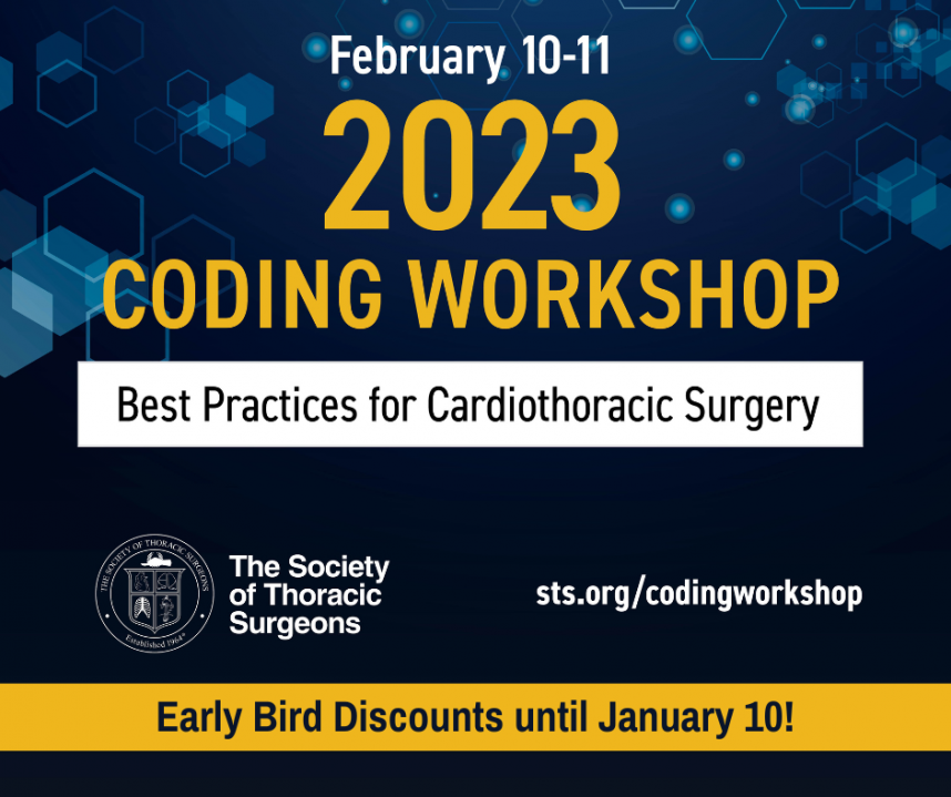 Learn the latest coding changes for 2023 by attending or sending your coders to the 2023 STS Coding Workshop: Best Practices for Cardiothoracic Surgery. Taking place virtually February 10 – 11, this 2-day workshop will address new and revised codes affecting cardiothoracic surgical practices. The event will feature live sessions at conveniently scheduled times as well as recorded sessions that registrants can watch at their convenience. Learn more at sts.org/codingworkshop.