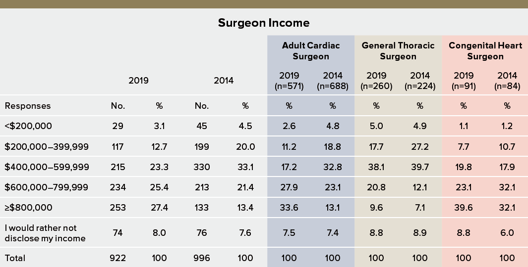 Both overall averages and breakdowns by discipline are illustrated in the STS practice survey, conducted every 5 years. In the most recent survey, 60.9% of responding surgeons reported an income of $200,000 to $799,999 per year, compared with 74.5% for respondents in the previous survey in 2014. Salaries increased for many—the percentage of surgeons reporting an income of $800,000 or more increased from 13.4% in 2014 to 27.0% in 2019. The most selected income range among those provided, reported by 24.8% of respondents overall, was $600,000 to $799,000 per year.