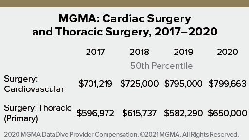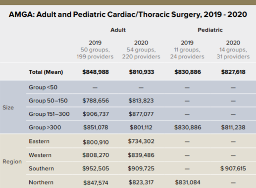 The 2021 report of the American Medical Group Association (AMGA), aggregated from 2020 data, represented two categories of interest to cardiothoracic surgeons: “Cardiac/Thoracic Surgery” and “Cardiac/Thoracic Surgery—Pediatrics.” The mean reported salary, available courtesy of the author, Elizabeth Siemsen, AMGA consulting director, was $810,933 for the former category and $827,618 for the latter.