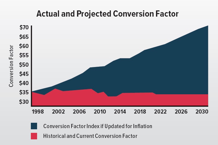 Medicare payment is the product of RVUs and the Medicare “conversion factor,” which the Centers for Medicare & Medicaid Services (CMS) sets annually. When the Medicare Access and CHIP Reauthorization Act of 2015 (MACRA) was first passed, it provided base updates to the conversion factor through the 2019 payment year to encourage providers to migrate from the Merit-based Incentive Payment System to Alternative Payment Models (APM).